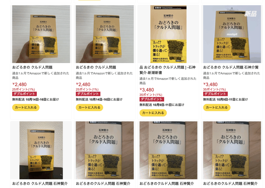 おどろきの「クルド人問題」を買ったのですが、紙の書籍が売り切れらしく、誤って転売ヤーのほうから買ってしまいましたよ。今確認したら電子書籍もある。私としては電子書籍のほうが良かったので、間違ってポチしてしまった自分にめちゃくちゃ腹が立ちました。8mmを編集しながらのポチしちゃったんで集中力が切れてましたね〜。