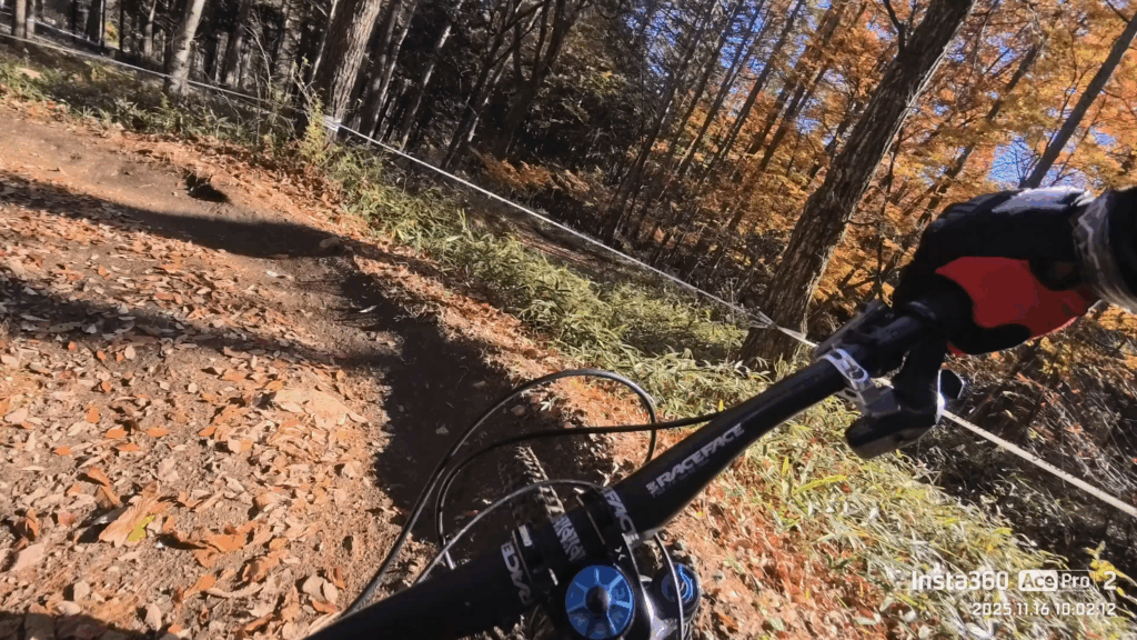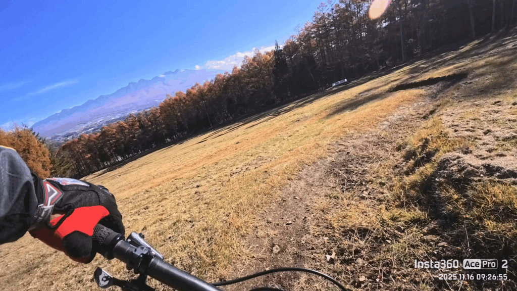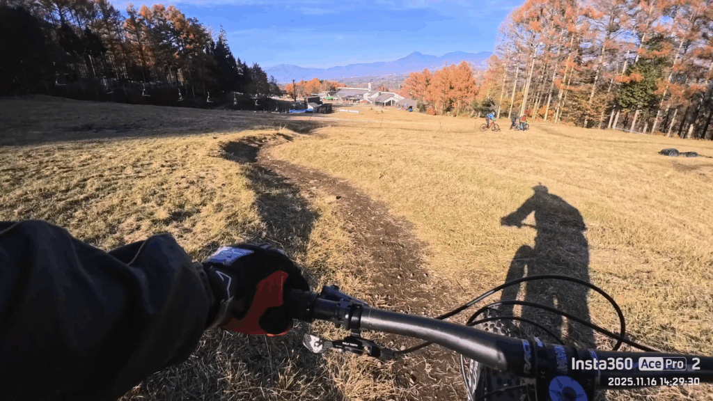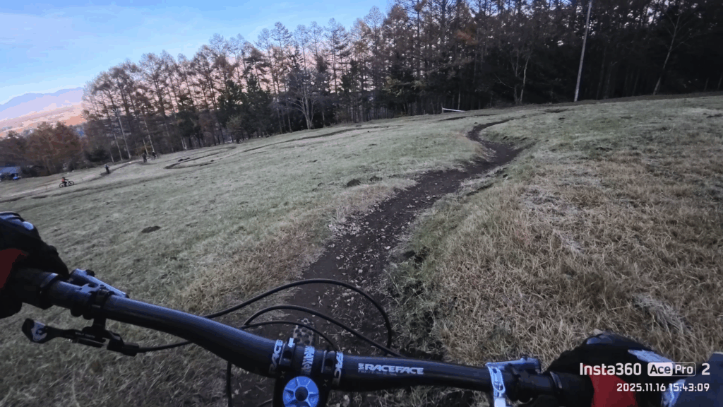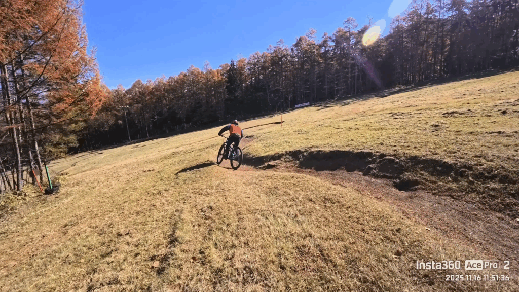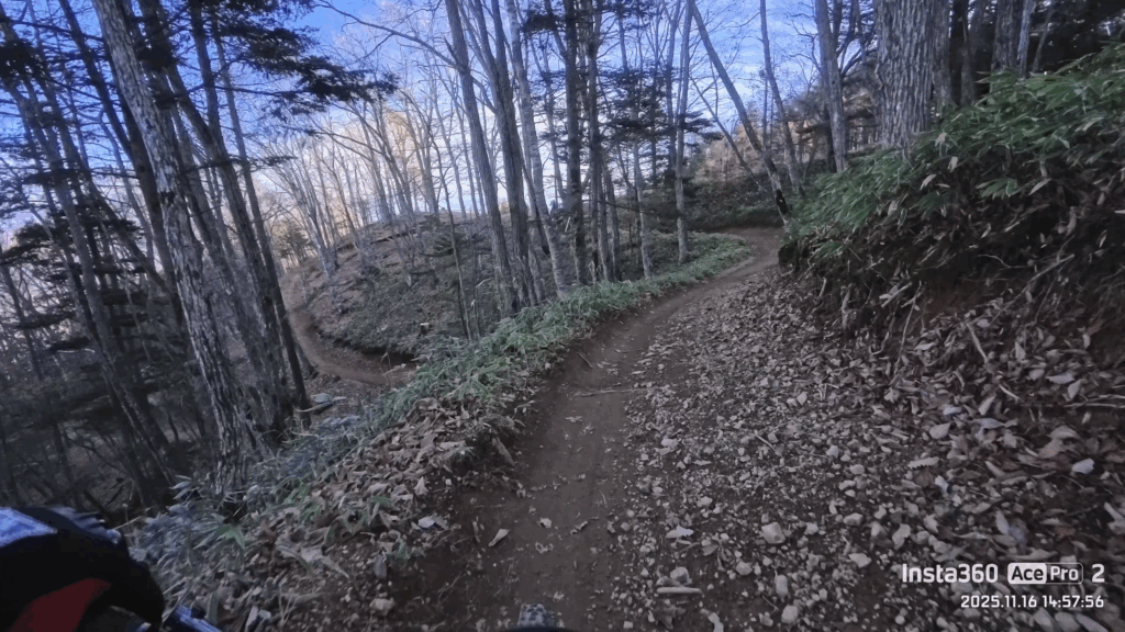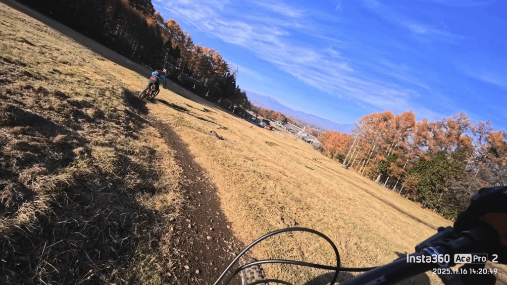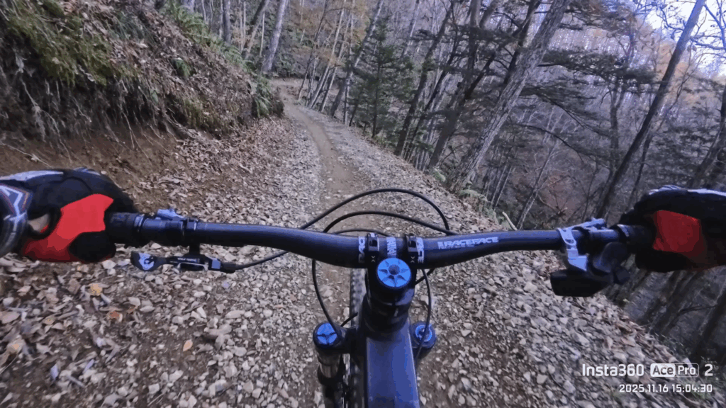 2本目は見習い。何でもないところで前輪を取られてヒヤッとする。それにしても、Insta360 Ace Pro 2のMEGA広角、画角が狭いですね。前輪がもう少し写っていれば振り返りもしやすかったのでしょうが…。まあ、転けても右側だったと思うので、肋骨は守れたかも。