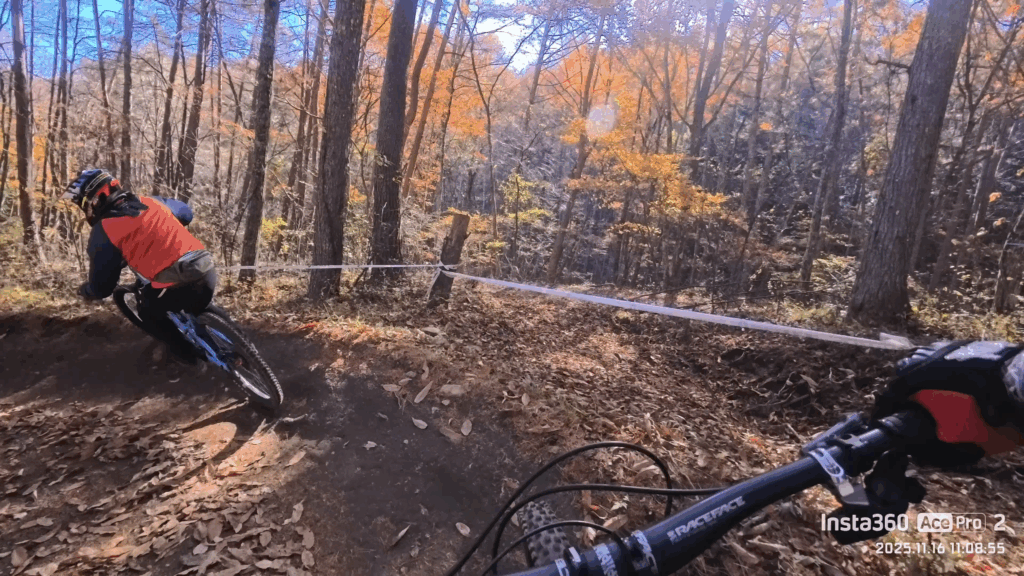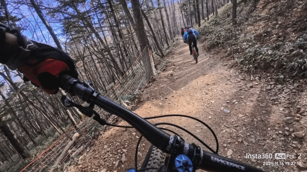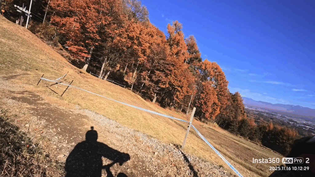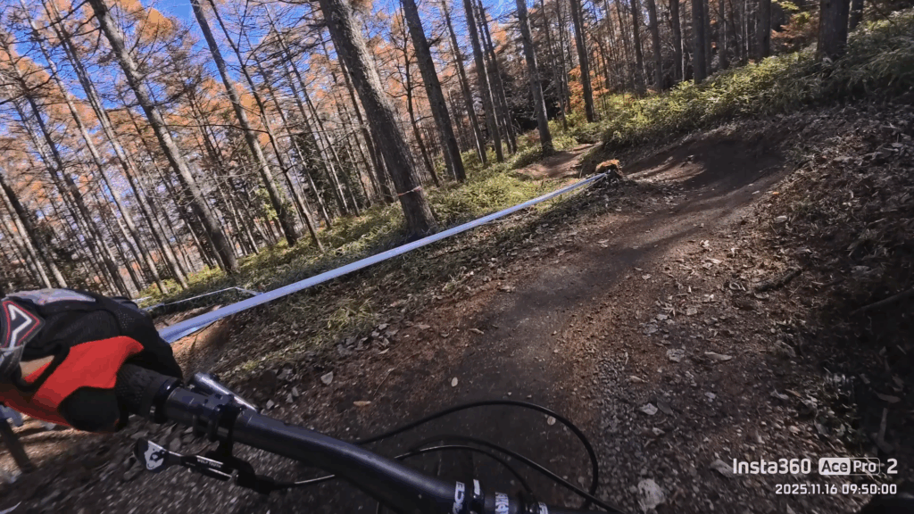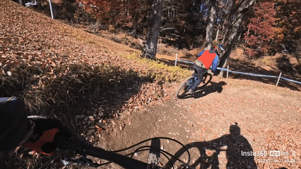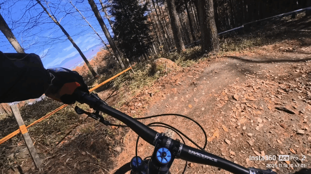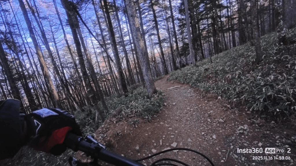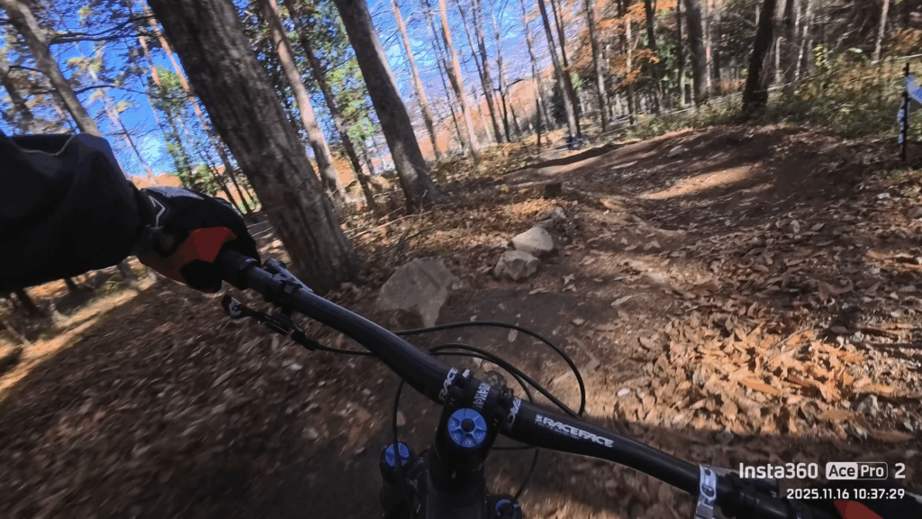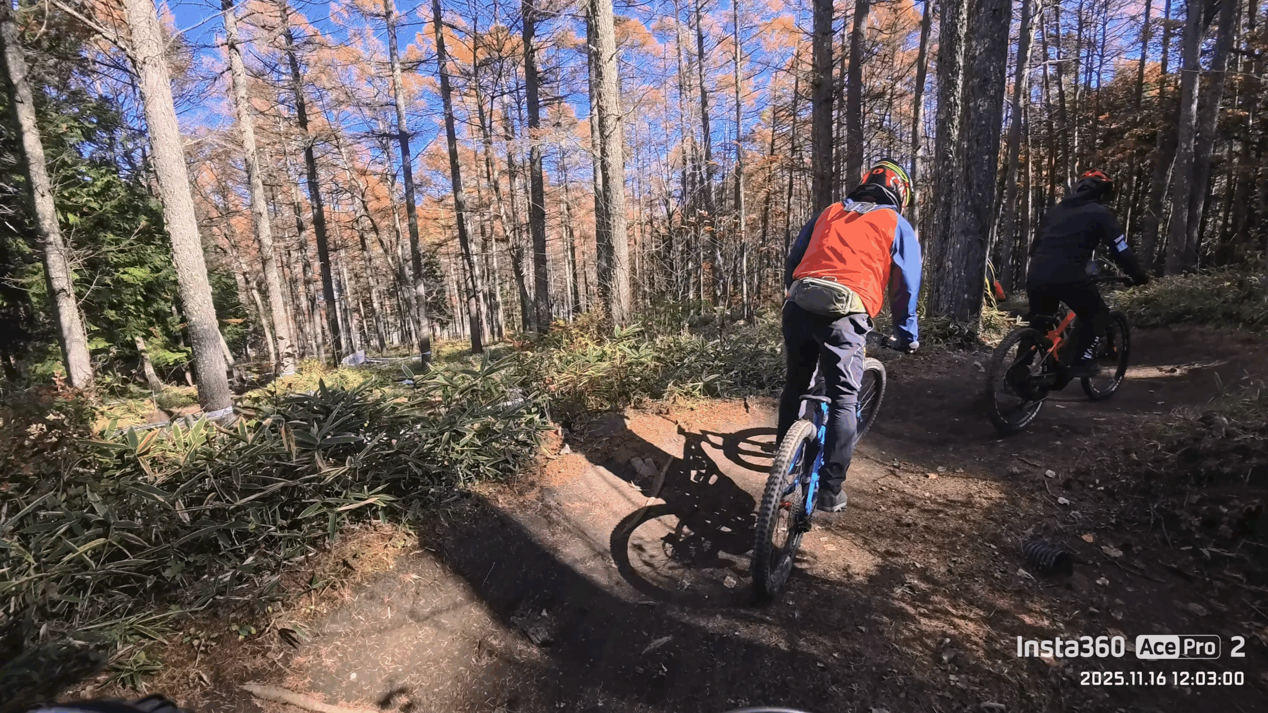 2本目は見習い。何でもないところで前輪を取られてヒヤッとする。それにしても、Insta360 Ace Pro 2のMEGA広角、画角が狭いですね。前輪がもう少し写っていれば振り返りもしやすかったのでしょうが…。まあ、転けても右側だったと思うので、肋骨は守れたかも。