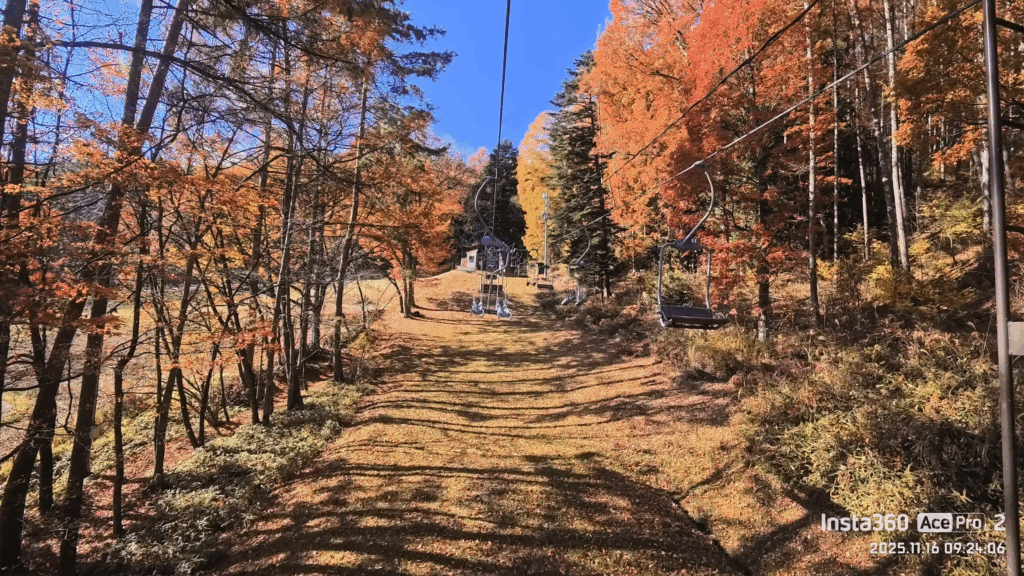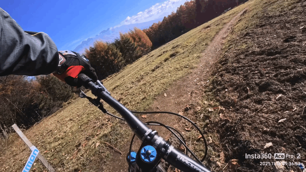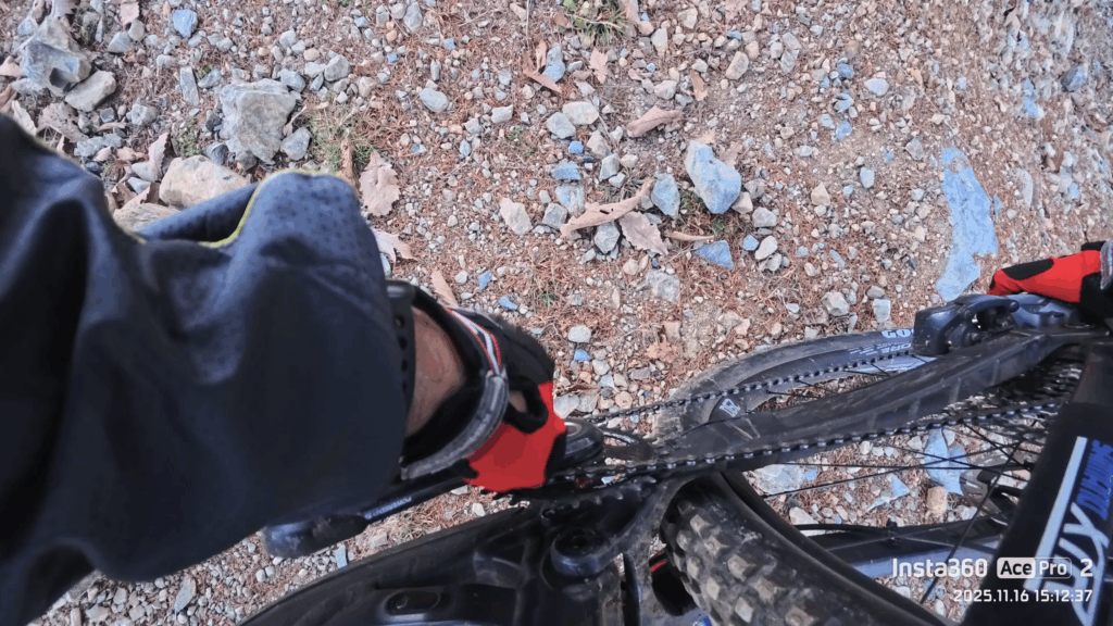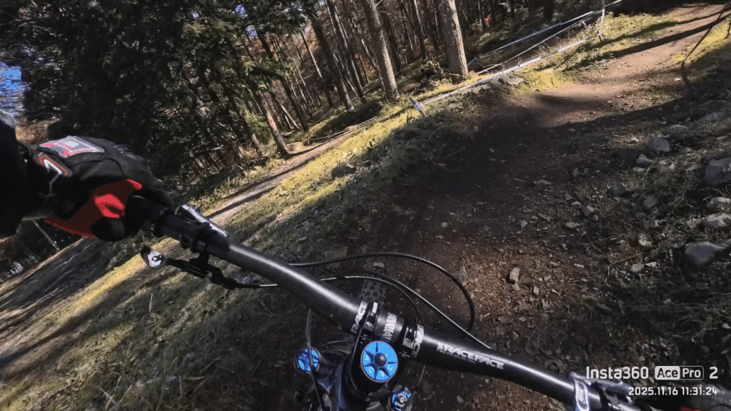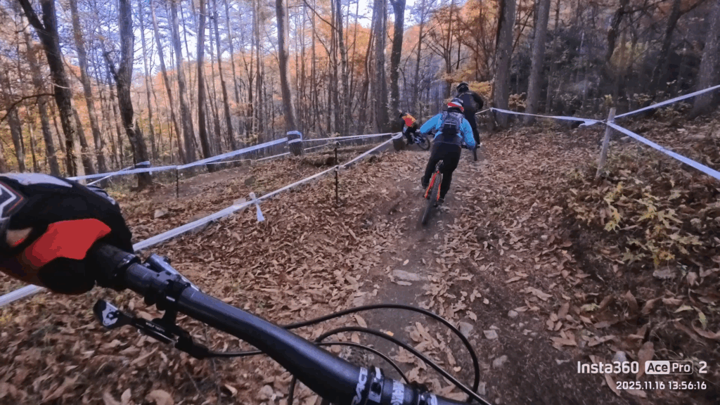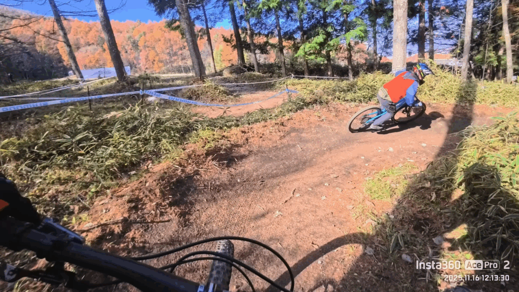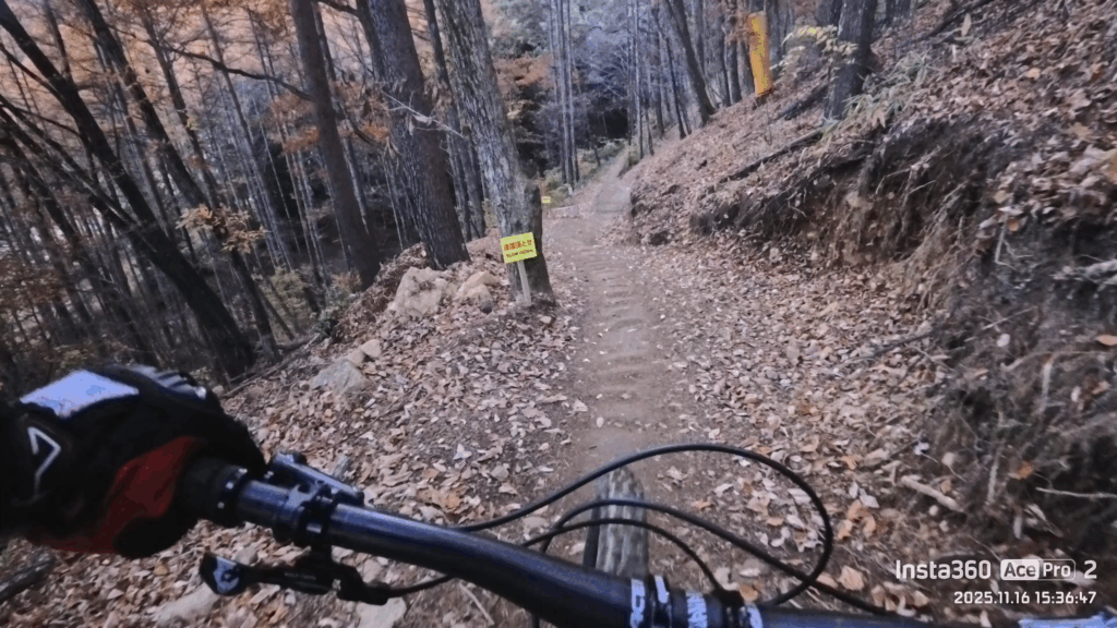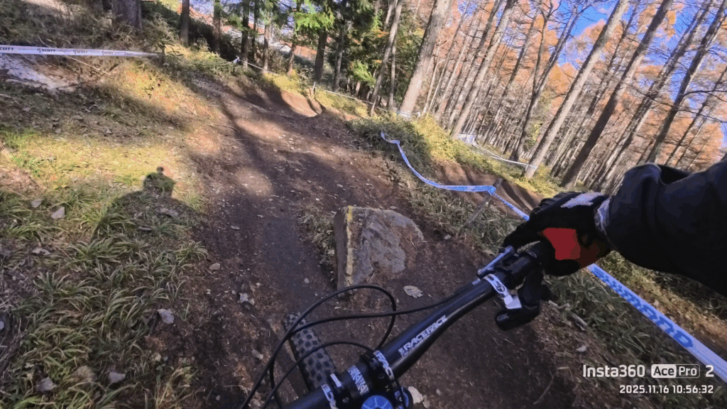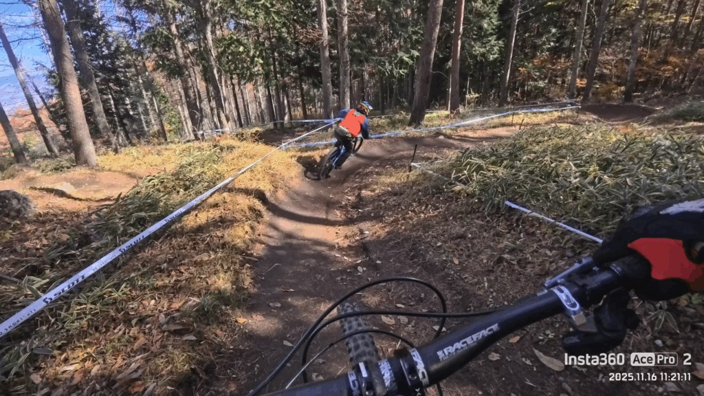 2本目は見習い。何でもないところで前輪を取られてヒヤッとする。それにしても、Insta360 Ace Pro 2のMEGA広角、画角が狭いですね。前輪がもう少し写っていれば振り返りもしやすかったのでしょうが…。まあ、転けても右側だったと思うので、肋骨は守れたかも。