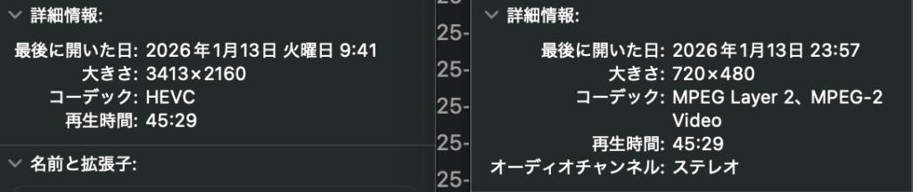 再生時間を見ると両者一致しているようなので、音だけ元ファイルから取りだして、くっつけるか。